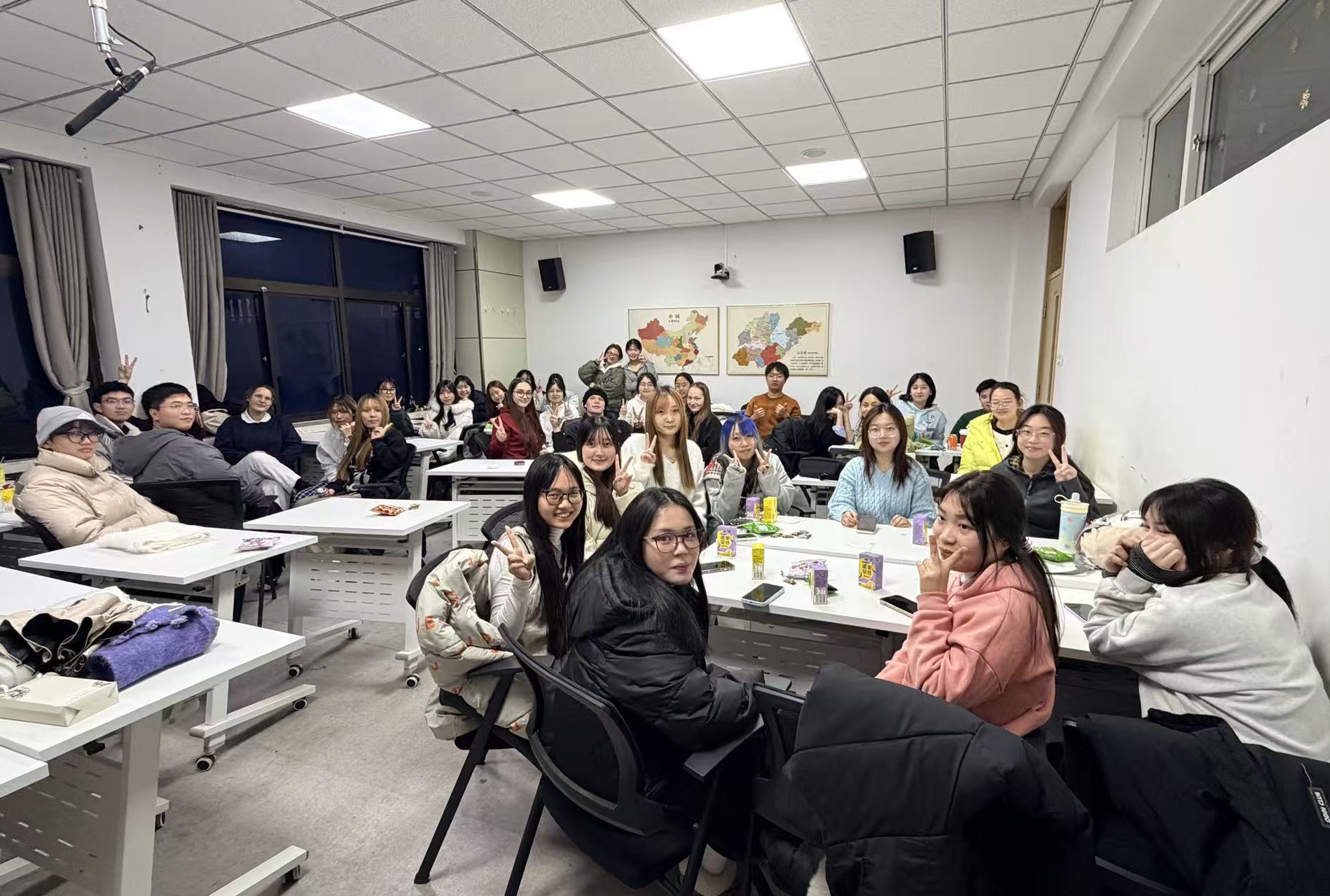在核心的“文化分享环节”,同学们纷纷介绍家乡的特色美食、著名景点及姓名姓氏文化,部分同学还现场借助地图直观呈现地域风貌——缅甸留学生描绘的本国特色、俄罗斯同学展示的家乡城市风光,与中国学生推荐的烟台山、蓬莱阁美景相映成趣,让小小的教室成为浓缩世界风情的“微型文化展览馆”。